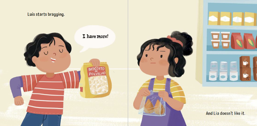 Brother and sister go to the family store to get a snack, biscuits for Luís and croquettes for Lia. Luís brags that he has more: His bag is taller, wider, and deeper than Lia’s. But Lia points out that she has two croquettes and Luís has only one bag, so she has more. Luís counters that he has 100 biscuits and Lia has only two croquettes, so he has more. But Lia figures out another way to show that she has more. What is it? At the end, they figure out a way to share equally. Yum!