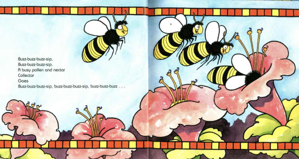 This story introduces children to different bugs, each with its own pattern. The bees buzz-buzz-buzz-sip, buzz-buzz-buzz-sip the pollen and nectar. The butterflies flutter-float-flutter-float in the sky while the cricket loudly chicka-chirp-chirps, chicka-chirp-chirps. Children can listen for the patterns and look for them hidden in the illustrations until nighttime appears and the bugs go to sleep.