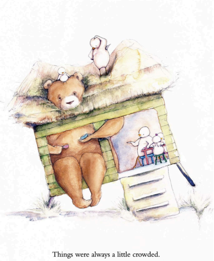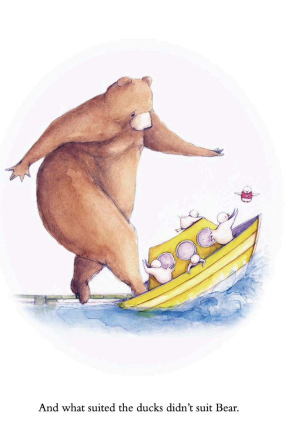 Bear befriends a family of little ducks, but soon discovers that their house is too small and crowded for him to live there with them. Bear and the ducks go on a quest to find a new home big enough for all of them but they cannot find one that is just the right size. Very sad, Bear worries that he will never find a home for him and his beloved ducks. Will large Bear find the perfect place to live with his small family?