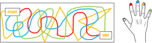 • Use stickers or markers to put a colored dot on each of your child’s fingernails. Draw a maze using different colored pathways (see an example below). Have your child trace each path with the matching colored finger.